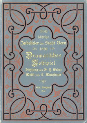 Munzinger, C[arl]/Weber H.: Dramatisches Festspiel [zur] 700jährige[n] Jubelfeier der Stadt Bern 1891. Zur Erinnerung an ihre Gründung 1191. Bern: Otto Kirchhoff 1891. Lex.-8°. 1 Klavierauszug mit Text (121 S.), Leinen mit mehrfarbig geprägtem Einbandschmuck und umlaufendem Rotschnitt (Buchblock gebrochen, dadurch leicht locker; erste Seiten wenig abgegriffen; Einbandecken leicht bestossen; Kanten leicht berieben; sonst altersgemäss gut erhalten)