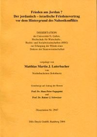 Luterbacher, Matthias Martin J.: Frieden am Jordan? Der jordanisch-israelische Friedensvertrag vor dem Hintergrund des Nahostkonflikts. Bamberg: Difo-Druck 2004. 8°. 476 S., broschiert (private Widmung des Autors auf Vorsatz; gut erhalten)