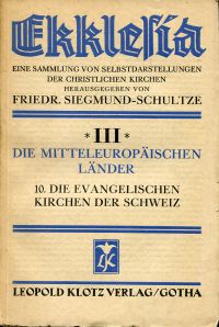 Die evangelischen Kirchen der Schweiz. Gotha: Klotz 1935. Gr.-8°. 253 S., broschiert (Seiten teilweise nicht beschnitten; Umschlag angestaubt; Rücken mit Fehlstelle; sonst altersgemäss gut erhalten) (=Ekklesia, eine Sammlung von Selbstdarstellungen der christlichen Kirchen / hrsg. von Friedr. Siegmund-Schultze ; 3; Die mitteleuropäischen Länder; 10)