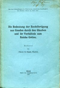 Staub, Emil: Die Bedeutung der Rechtfertigung aus Gnaden durch den Glauben und ihr Verhältnis zum Reiche Gottes. Referat. Zürich: Schulthess 1917. 8°. 67 S. broschiert (Umschlag abgegriffen und mit Marginalien versehen; Papier altersbedingt leicht gebräunt; sonst altersgemäss gut erhalten)