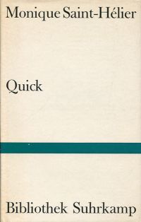Saint-Hélier, Monique (d. i. Monique Briod): Quick. Erzählung. [2. Aufl.], 5. – 6. Tsd. Frankfurt/Main: Suhrkamp 1962. 8°. 111 S., Pappband (angebräunt; gut erhalten) (=Bibliothek Suhrkamp, Bd. 26)