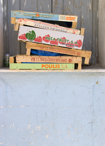 bildreich karten PK 629: sommerfrisch. Hochformat. (Obst, Obstkisten, Obstgebinde, Mauer, Stapel, Händler, Griechenland, Lesbos) Mindestbestellmenge: 15 Karten (auch assortiert).