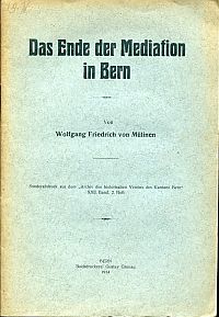 Mülinen, Wolfgang Friedrich von: Das Ende der Mediation in Bern. Bern: Grunau 1914. 8°. 56 S., geheftet (Besitzervermerk auf Titelblatt; Papier altersbedingt leicht gebräunt; Schnitt stockfleckig) (=Separatdruck aus: Archiv des Historischen Vereins des Kantons Bern; 22/2)