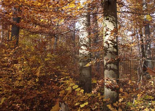 bildreich karten PK 739: spaetes licht. Querformat. (Wald, Baum, Herbstfärbung, Stamm, Sonne, Schatten, Licht) Mindestbestellmenge: 15 Karten (auch assortiert).