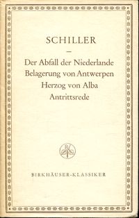 Schiller, Friedrich: Der Abfall der Niederlande. Belagerung von Antwerpen. Herzog von Alba. Antrittsrede. Basel: Birkhäuser 1946. 8°. XIX, 458 S., Halbleinen (gut erhalten) (=Birkhäuser-Klassiker; 49)