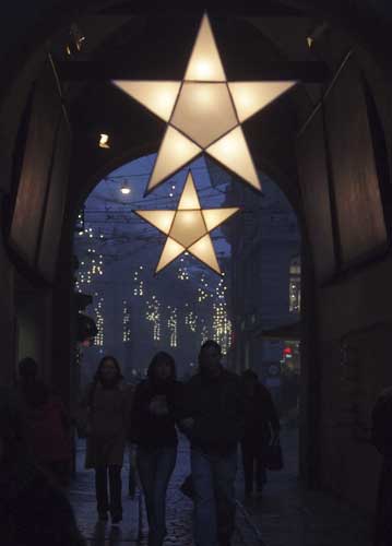 bildreich karten PK 754: sternentor. Hochformat. (Weihnachtsschmuck, Weihnachtsdekoration, Stern, Zytglogge, Bern, Tor, Torbogen, Abend, Abendlicht, Advent, Bummel)
